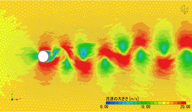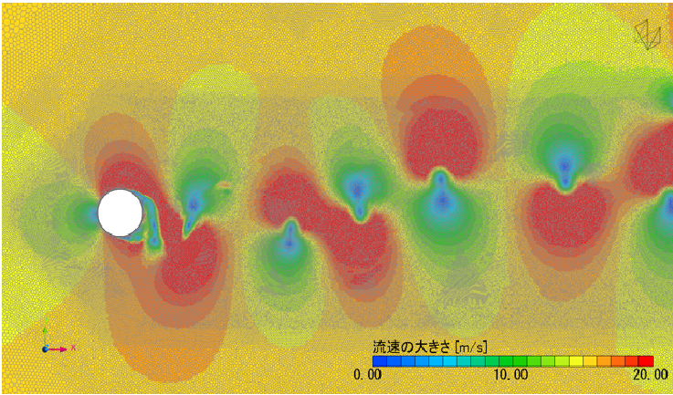 流体が円柱にぶつかると、その後部にはカルマン渦による流速分布がみられます。