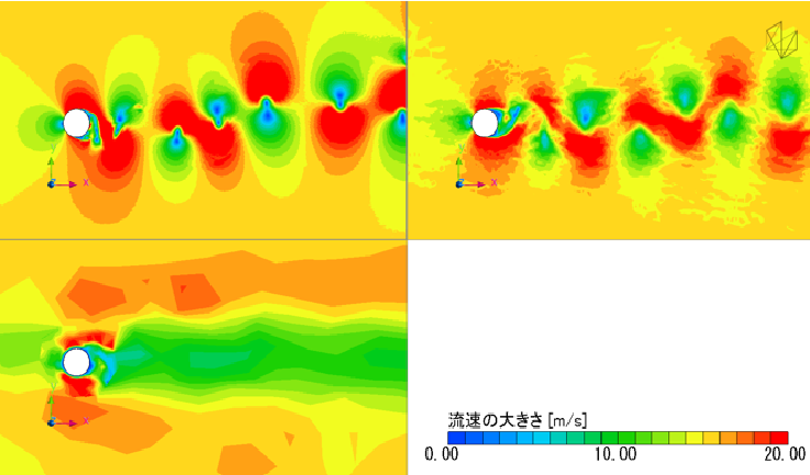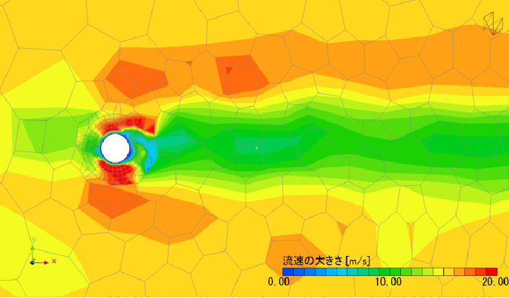 メッシュサイズを2倍程度大きくして解析をしてみました。円柱後部の流速分布についてはおおきくは違いがみられませんが、カルマン渦の境目がぼやけた見え方になります。