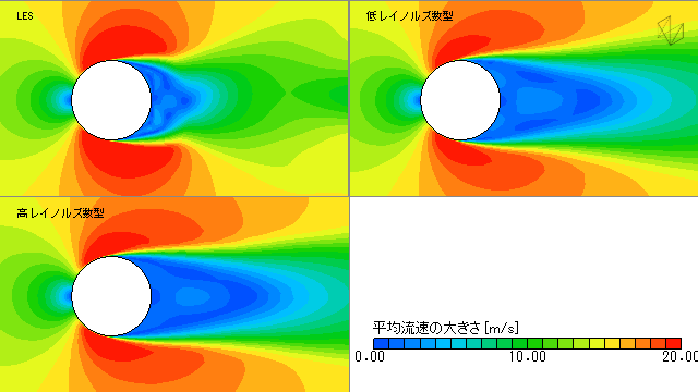 左図は横軸を壁面からの距離の無次元量、縦軸を流速の無次元量でプロットしたグラフです。この関係を壁関数と呼びます。 壁面からの距離の無次元量(以後Y+と記載)が4以下を粘性低層と呼び、層流の様相を示す領域です。 4以上30(~70)以下を遷移層といい、層流から乱流へと変化する領域です。 30以上を乱流層といい、乱流の様相を示す領域です。 ここで、実際に解析する場合の乱流モデルについて話をさせていただきますが、 高レイノルズ数型と言われる乱流モデルは乱流層での使用を想定したモデルで、低レイノルズ数型と言われる乱流モデルは粘性低層での使用を想定しています。 よくある間違いととして、低レイノルズ数型はレイノルズ数が低い乱流現象、高レイノルズ数型はレイノルズ数が高い乱流現象に対応していると誤認識されることが多いようです。