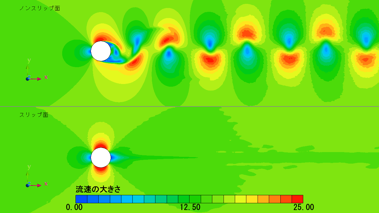 ここでは壁面上に抵抗が無く、剥離現象が起きづらいためにカルマン渦が発生しない結果となっています。