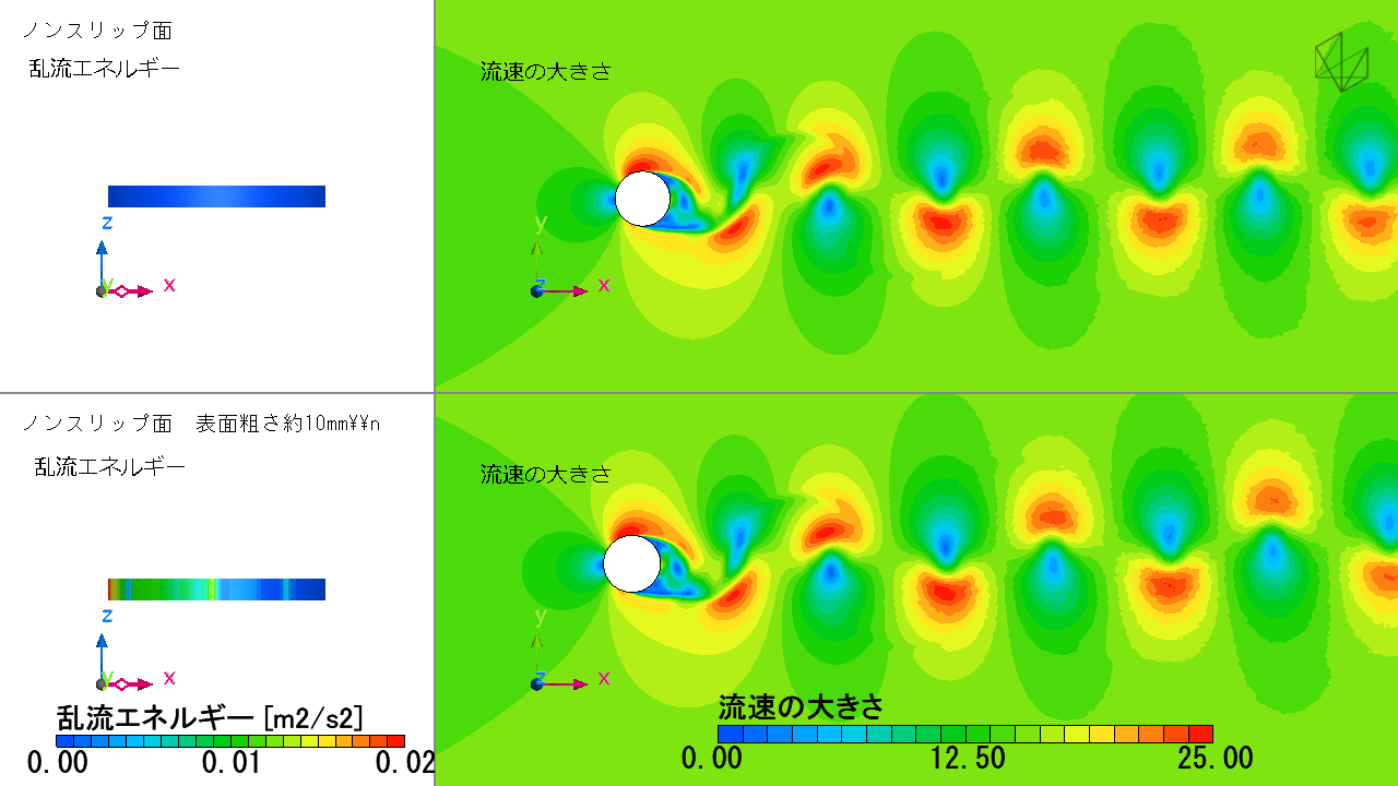 カルマン渦の発生状況に違いはあまり見られませんが、壁面近傍での乱流エネルギーに違いが見られます。