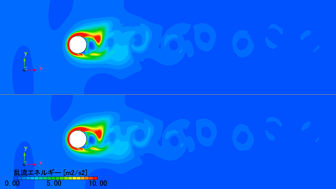 ただ、円柱そのものが小さいモデルで表面近傍での乱流エネルギーは小さいため、流れ場への影響が出ていません。