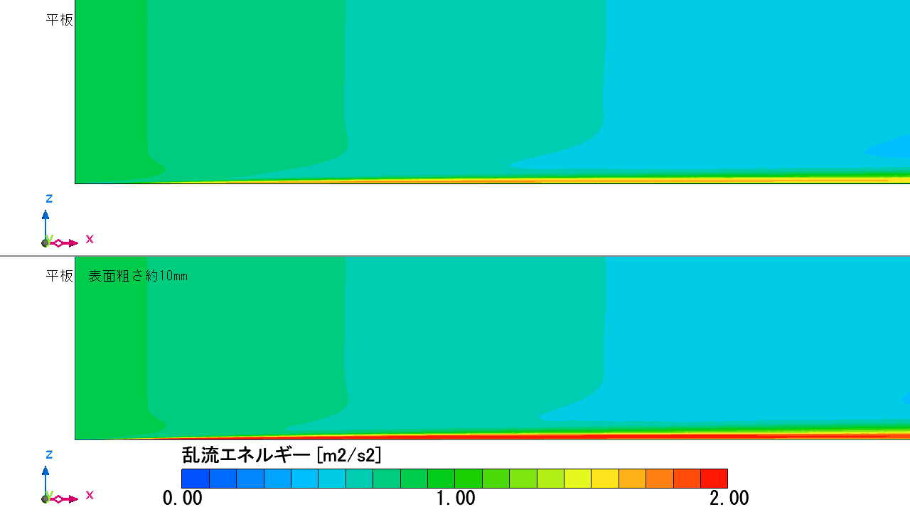 左図に平板上の乱流エネルギーを示しますが、下流にいくに従い、乱流エネルギーは大きくなっており、表面粗さを考慮した場合のほうが大きい値を示しています。
