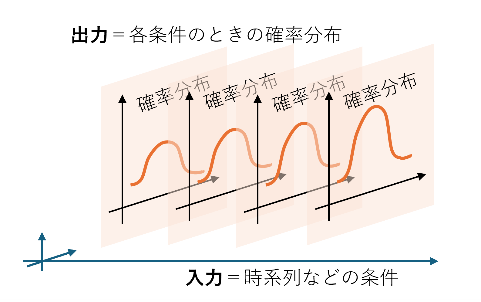 『過程』と聞くと、何かを進めている途中や工程、プロセスを連想するかもしれません。ガウス過程の『過程』は、確率論の専門用語である『確率過程』から来ています。確率過程を調べると、『時間などの条件によって変化する確率変数の数理モデル』と説明されています。これは、時間などの条件(入力)に対して、出力が確率分布となるものを指します。通常の関数では、入力に対して出力が一意に決まりますが、確率過程では出力が確率分布関数となります。さらに、この分布がガウス分布※である場合をガウス過程と呼びます。