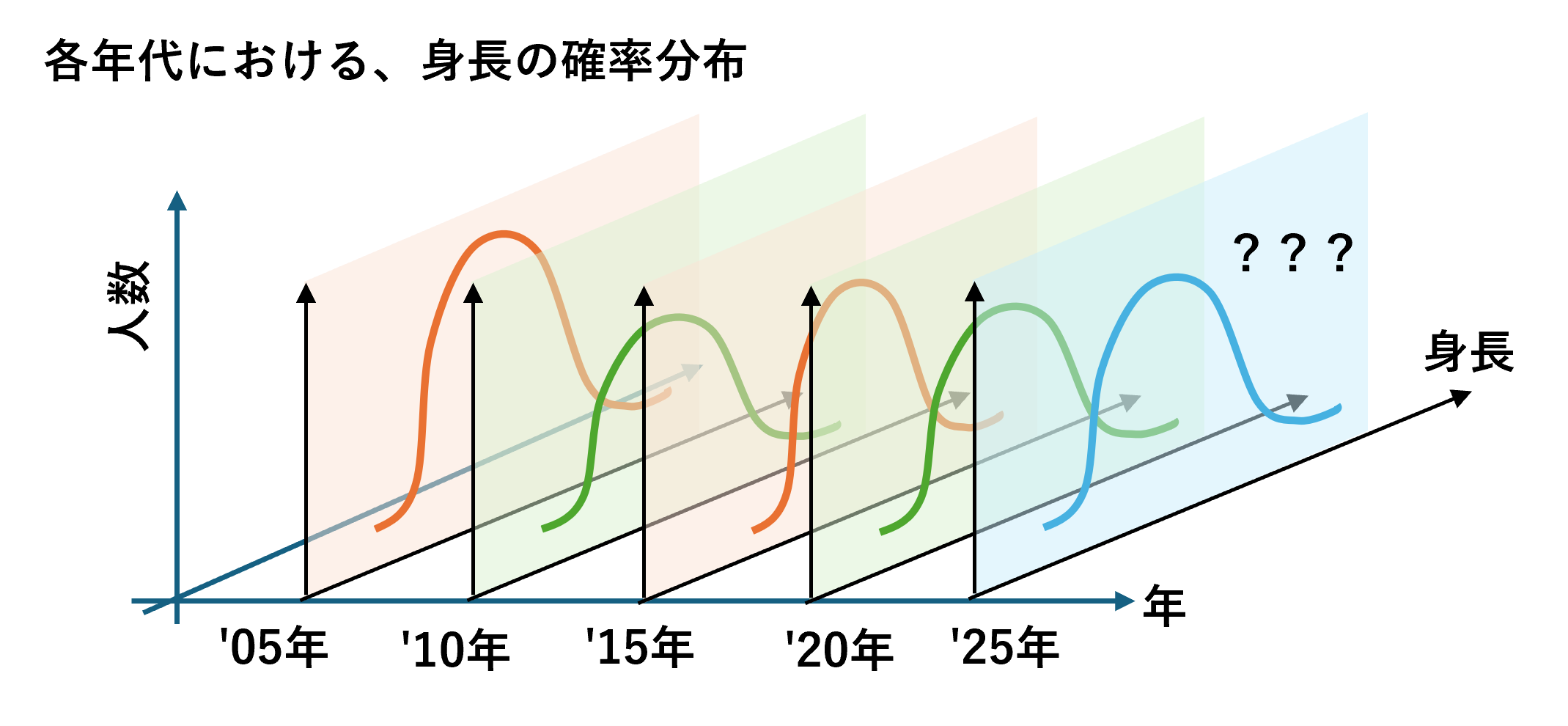具体的な例として、ガウス分布でよく知られているものに、身長と人数のグラフがあります。多くの人を集めて横軸に身長、縦軸に人数をとってグラフ化すると、ガウス分布が形成されると言われています。さらに、どの年齢層でもこの分布が成り立つそうです(面白いですね)。各年代のデータを学習させることで、未来の身長の確率分布を予測することが可能なのです。