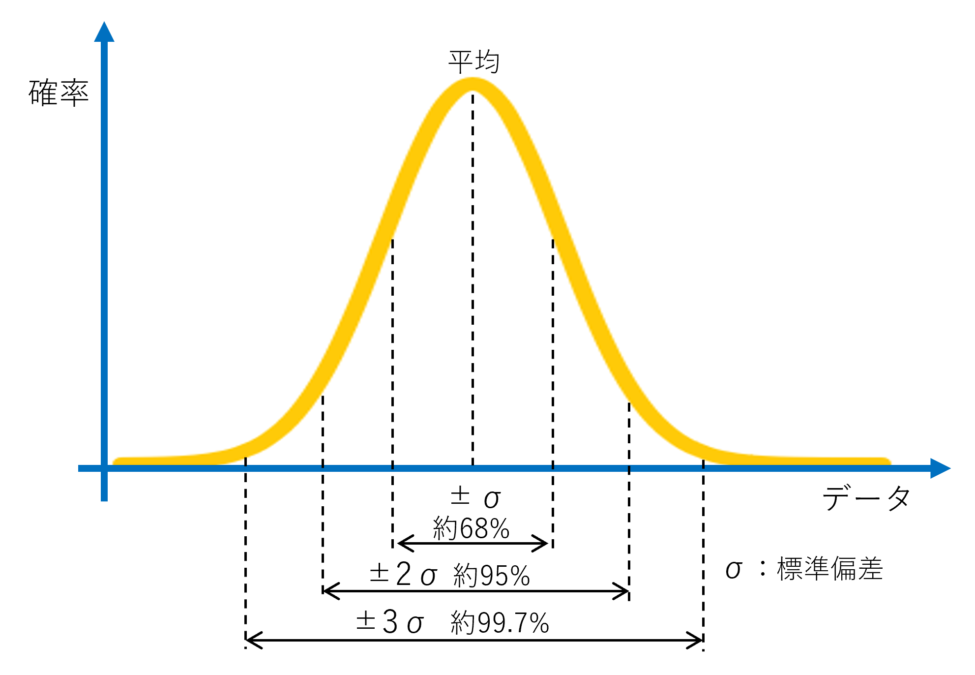標準偏差σを用いると、『平均値±σの範囲に、全データの約68%が存在する(σ:標準偏差)』という特徴があり、さらに『±2σの範囲に約95%、±3σの範囲に約99.7%のデータが存在する』となります。この特徴を利用した事例として、不良品の発生確率を測定し、±3σが規定の範囲に入っているかを確認するなど、品質管理に活用されることがあります。