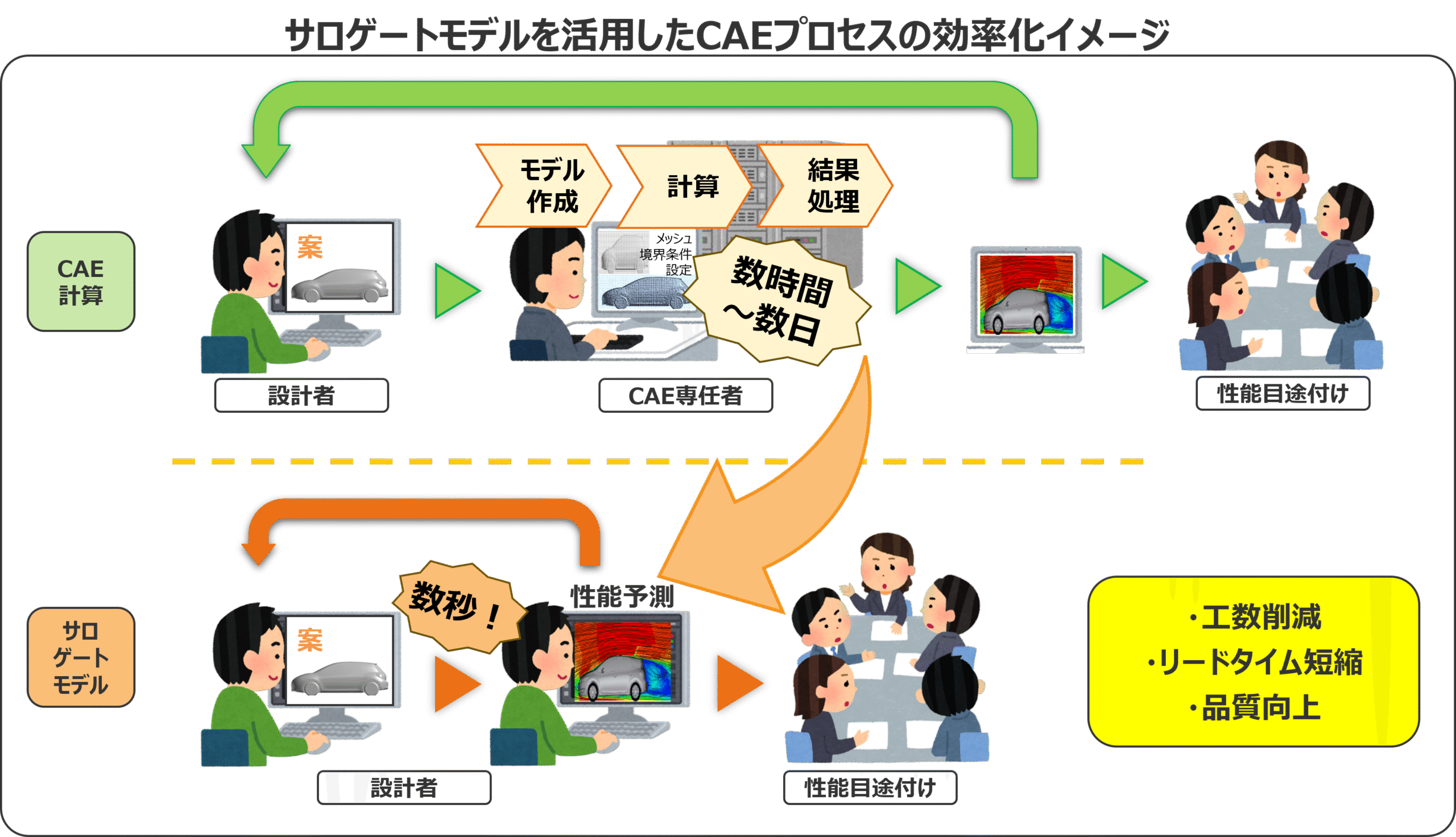 そこで、従来のシミュレーションを近似し、結果の予測を瞬時に行うサロゲートモデルが注目されています。