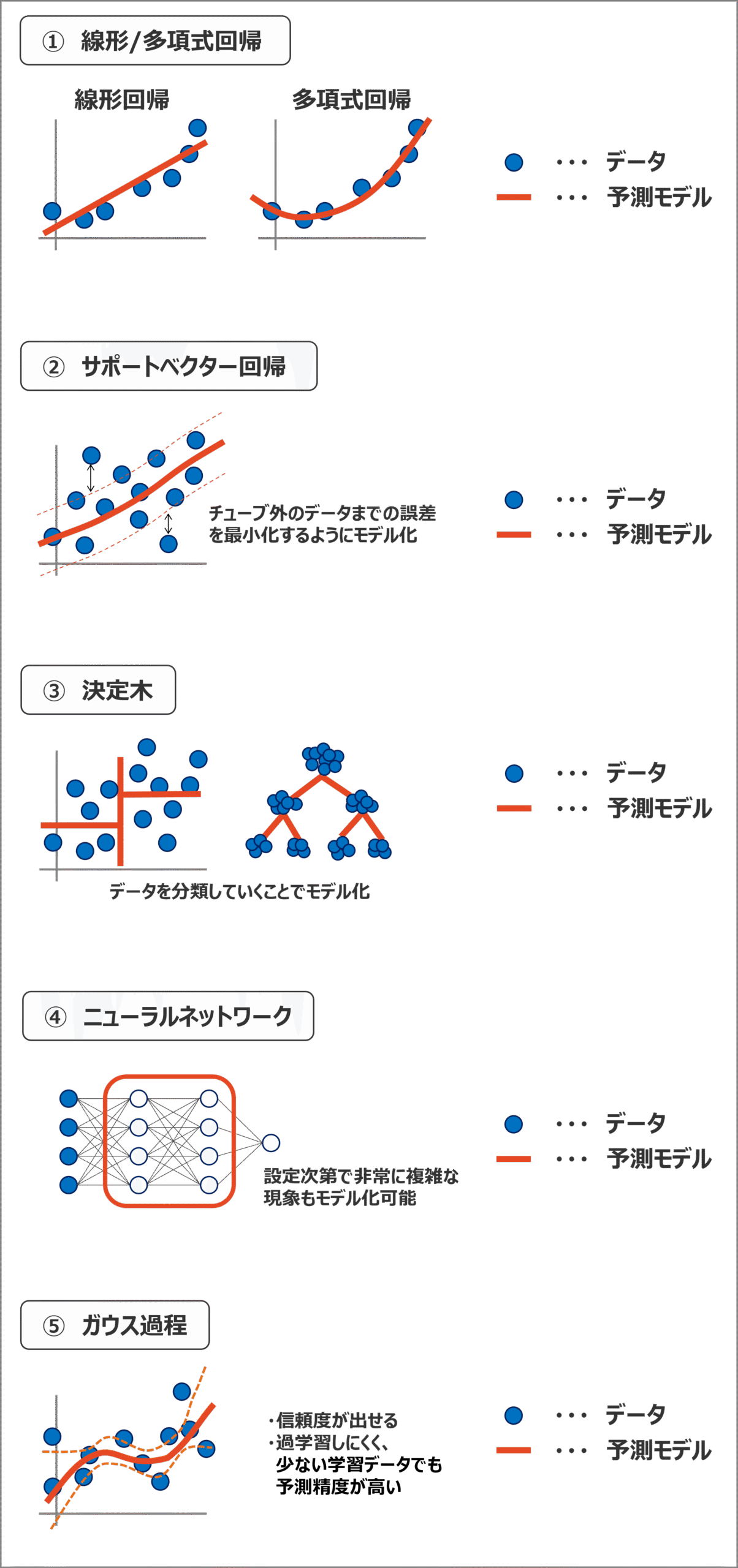 サロゲートモデルに使われるアルゴリズムにはいくつかの種類がありますが、代表的なものを以下に挙げます。 サロゲートモデルで特に問題となる「過学習」については、次章で説明いたします。
