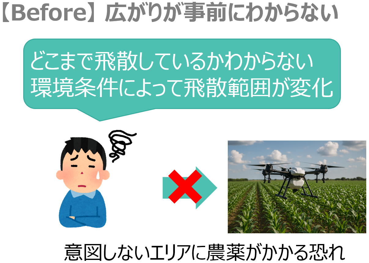 意図しない周辺エリアへの農薬飛散は、近隣農家とのトラブルや環境への影響につながります。しかし、実際の散布作業では飛散範囲を正確に把握することは不可能でした。